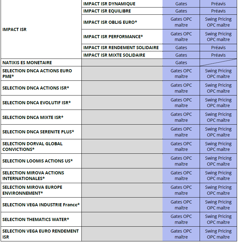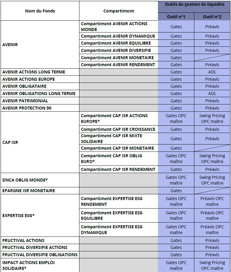 Afin de garantir une réponse plus efficace face aux pressions sur la liquidité en cas de tensions sur les marchés et de mieux protéger les investisseurs, les FCPE seront dotés de 2 outils de gestion de liquidité (un seul pour les fonds monétaires) selon le tableau en Annexe 2.